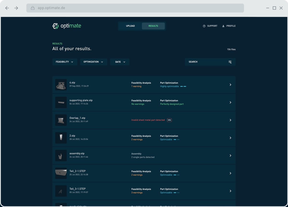 Optimate's cloud solution consists of two products: feasibility analysis and part optimization. In a first step, the user uploads his sheet metal part as STEP or SolidWorks format in the Web App. Multiple 3D CAD files can be uploaded and analyzed simultaneously. Structural steel, stainless steel and aluminum can be selected as material options. Within a few seconds, the system lists which part can be finished and how much potential is available.